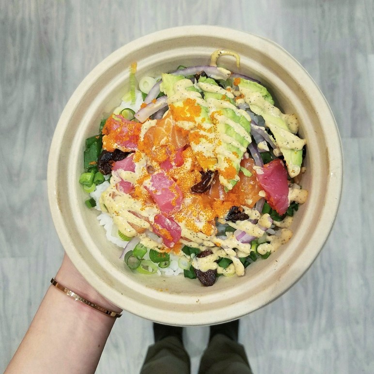 Pictured above: Large bowl ($6.12). Toppings – tuna, salmon, masago, avocado (+$1.65 each). Complimentary mix-ins – scallions, roasted garlic, red onion. Sauce: creamy garlic. (Total price: $12.72)