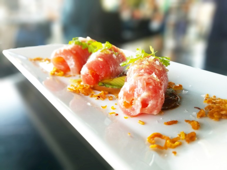 Pictured above: Tuna crudo – black garlic, avocado ($15) [I saw a picture of this on yelp before going and I thought the white parts were fat. I love highly marbled tuna (e.g. blue fin toro) and is disappointed to find that this is actually extremely lean tuna. However, it is well seasoned with large grains of salt, avocado, oil, deep fried garlic and I would still recommend it!]